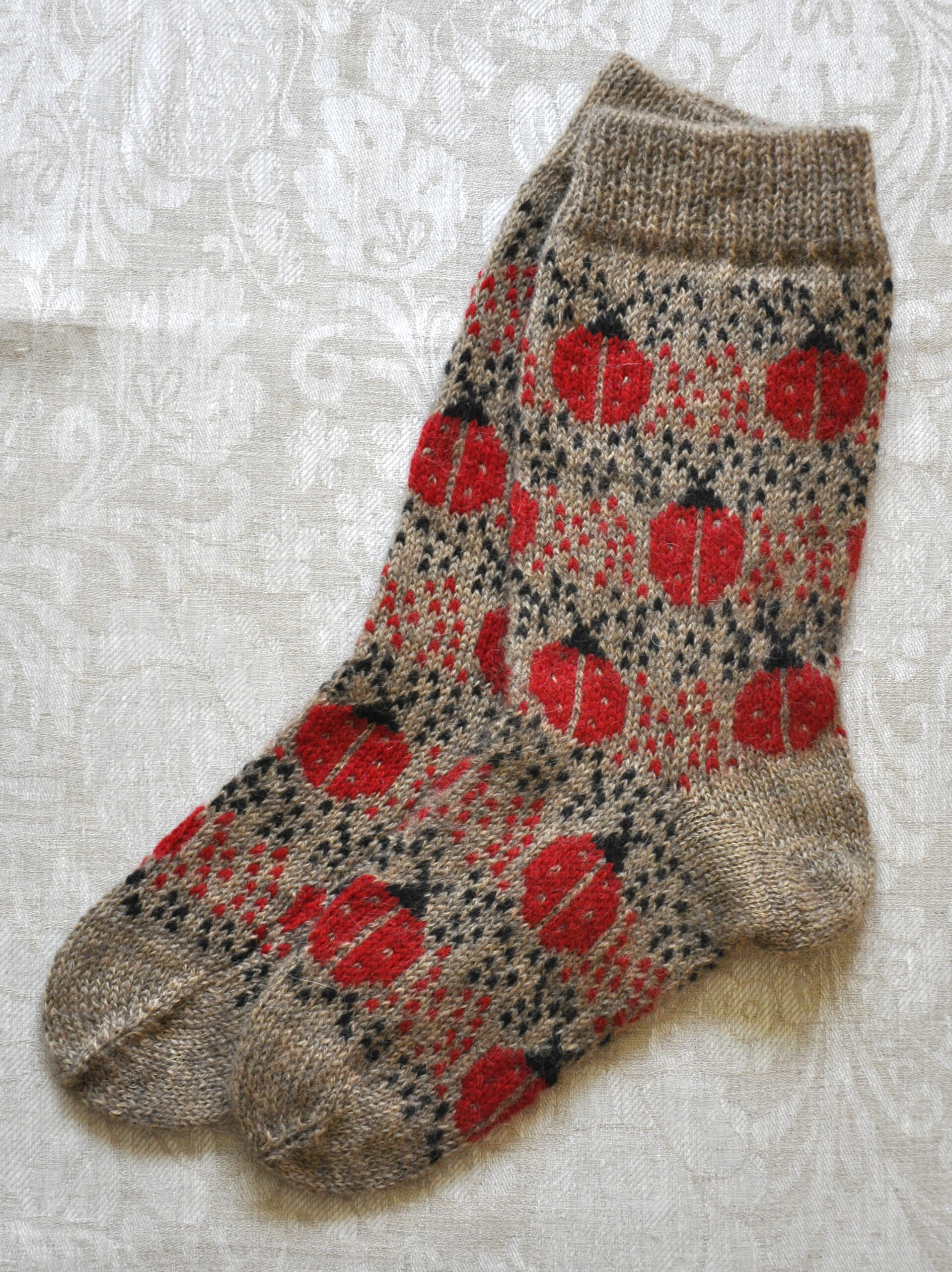 Värv:Pruunikas, punane ja must Kirjeldus: Käsikudumismasinal kootud sokid.