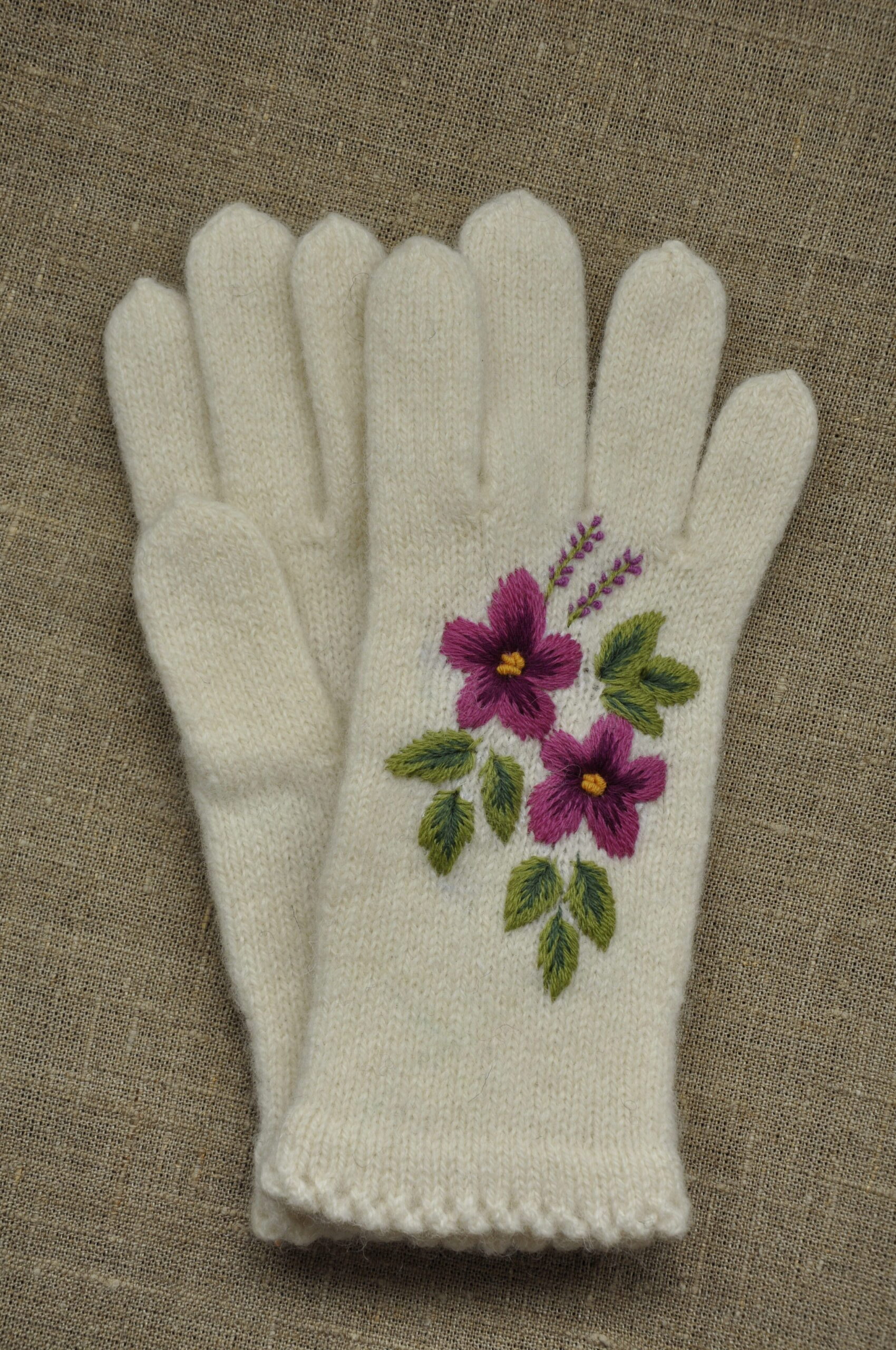 Kirjeldus: Käsikudumismasinal kootud ning käsitsi tikitud sõrmikud