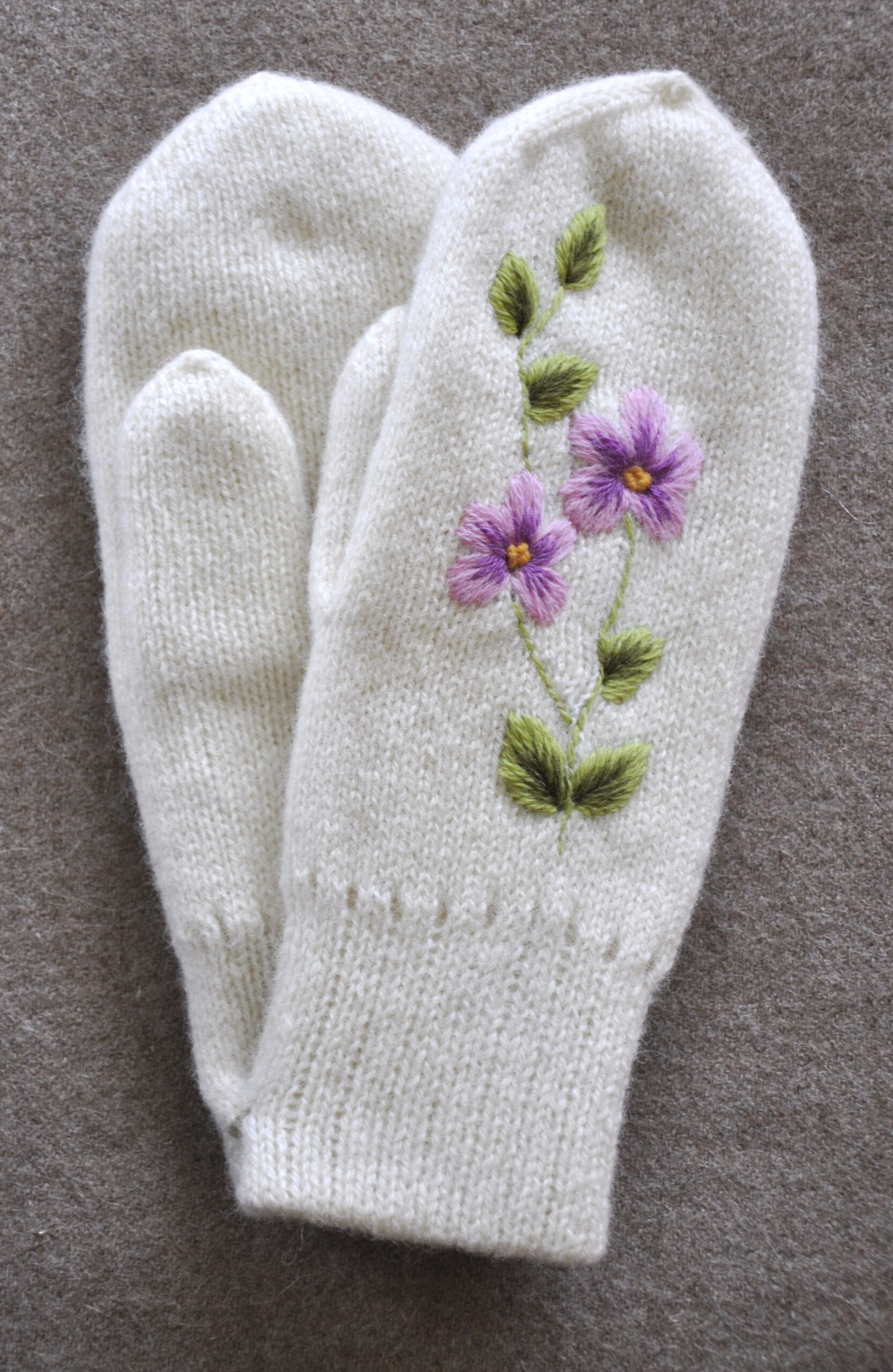Kirjeldus: Käsikudumismasinal kootud ning käsitsi tikitud topeltlabakindad