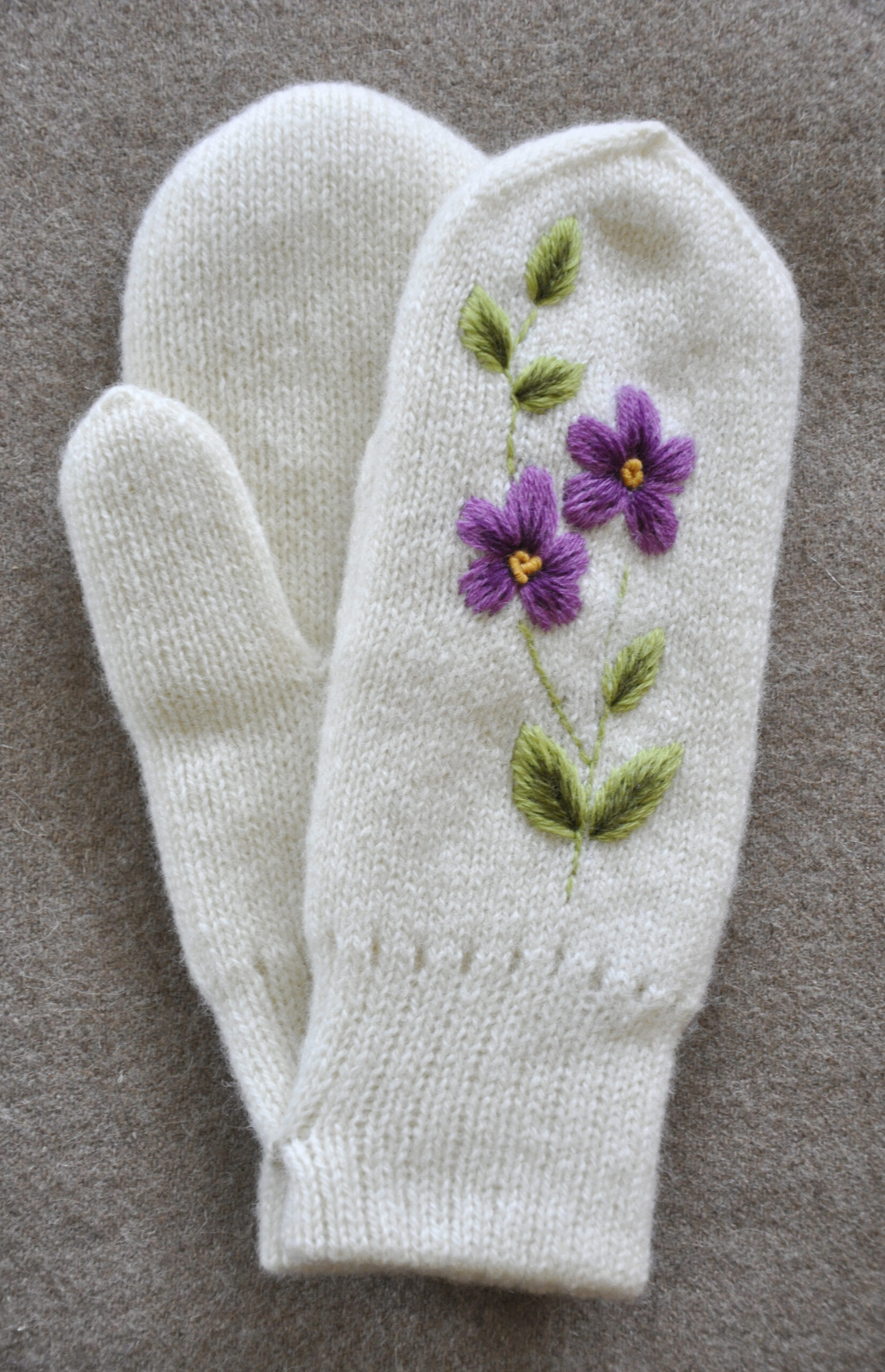 Kirjeldus: Käsikudumismasinal kootud ning käsitsi tikitud topeltlabakindad