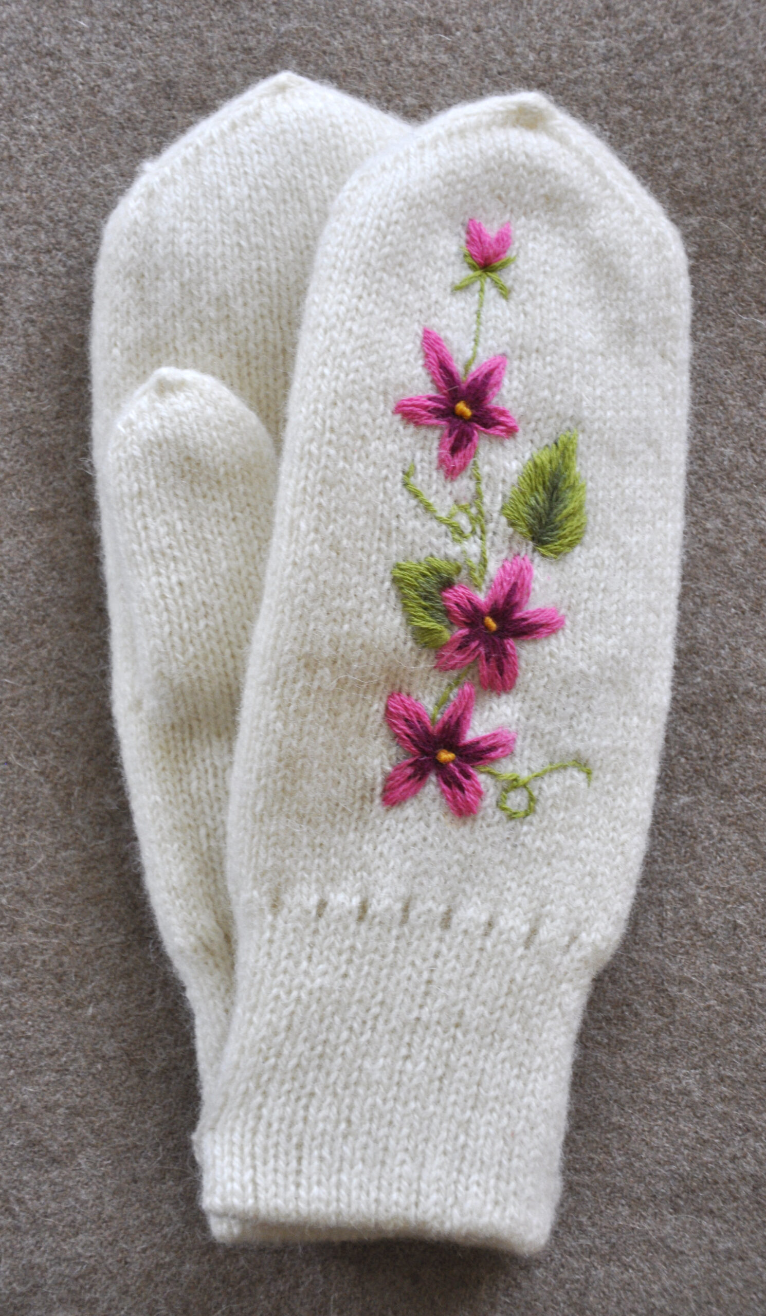 Kirjeldus: Käsikudumismasinal kootud ning käsitsi tikitud topeltlabakindad