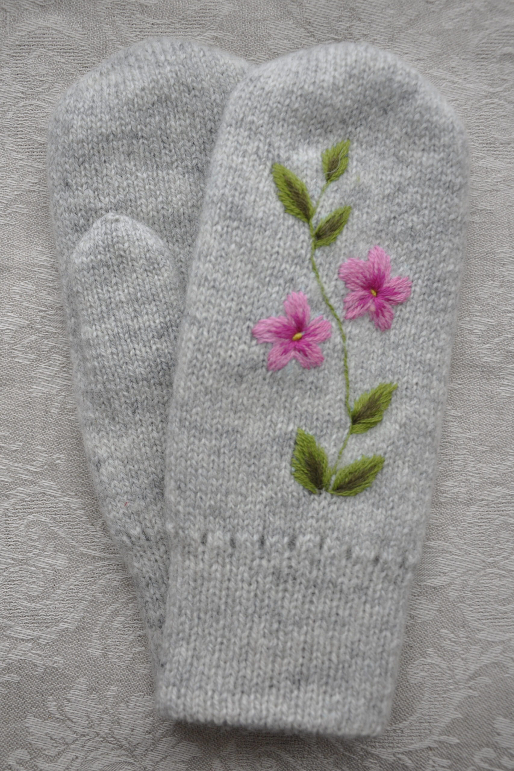 Kirjeldus: Käsikudumismasinal kootud ning käsitsi tikitud topeltlabakindad