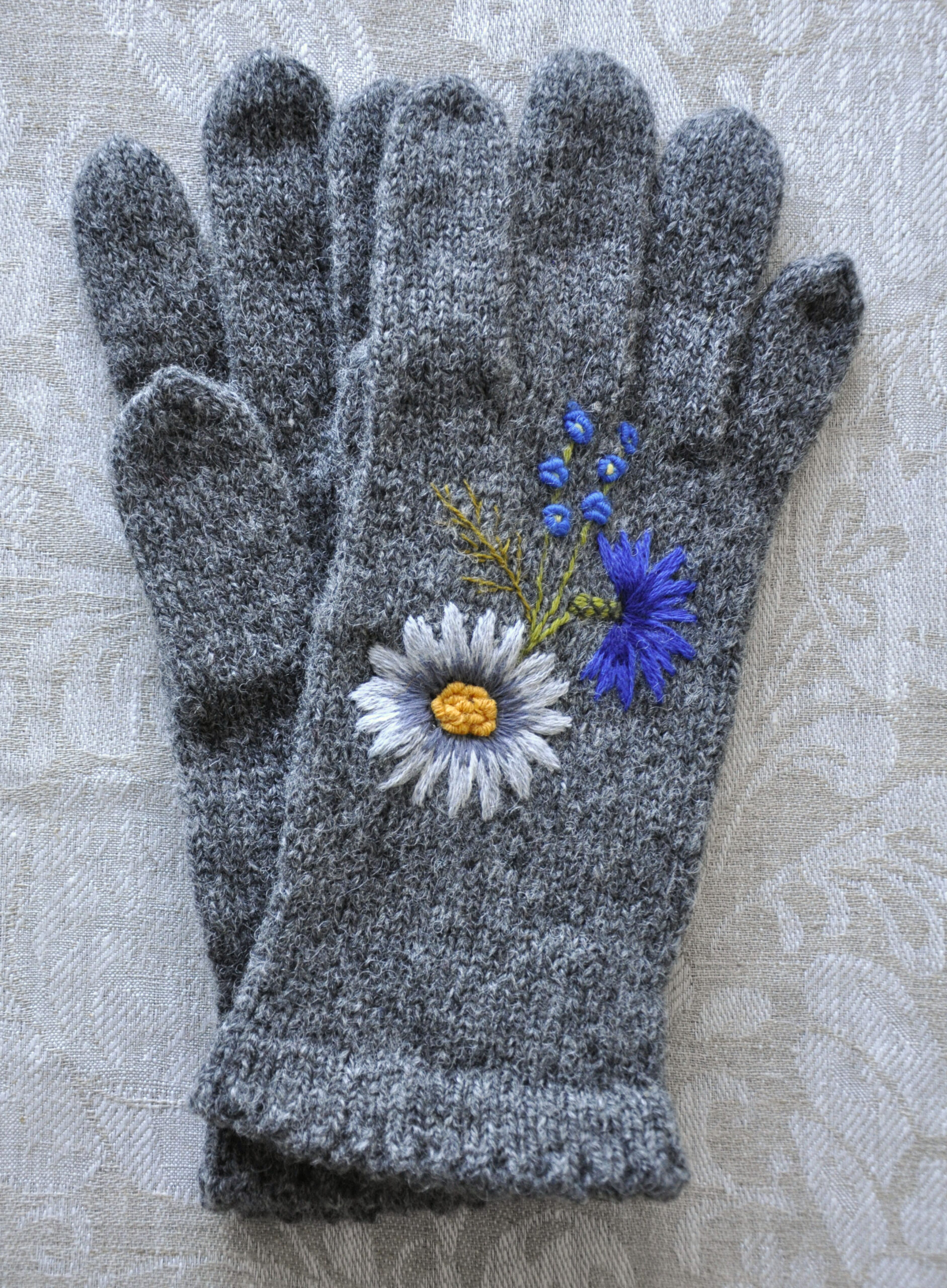Kirjeldus: Käsikudumismasinal kootud ning käsitsi tikitud sõrmikud