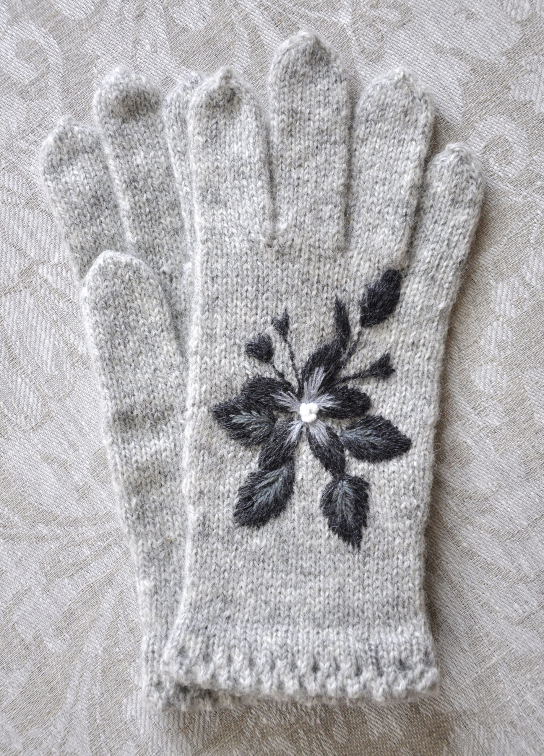 Kirjeldus: Käsikudumismasinal kootud ning käsitsi tikitud sõrmikud