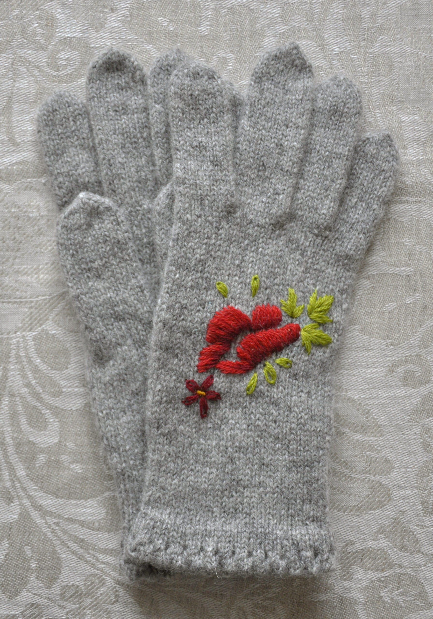 Kirjeldus: Käsikudumismasinal kootud ning käsitsi tikitud sõrmikud