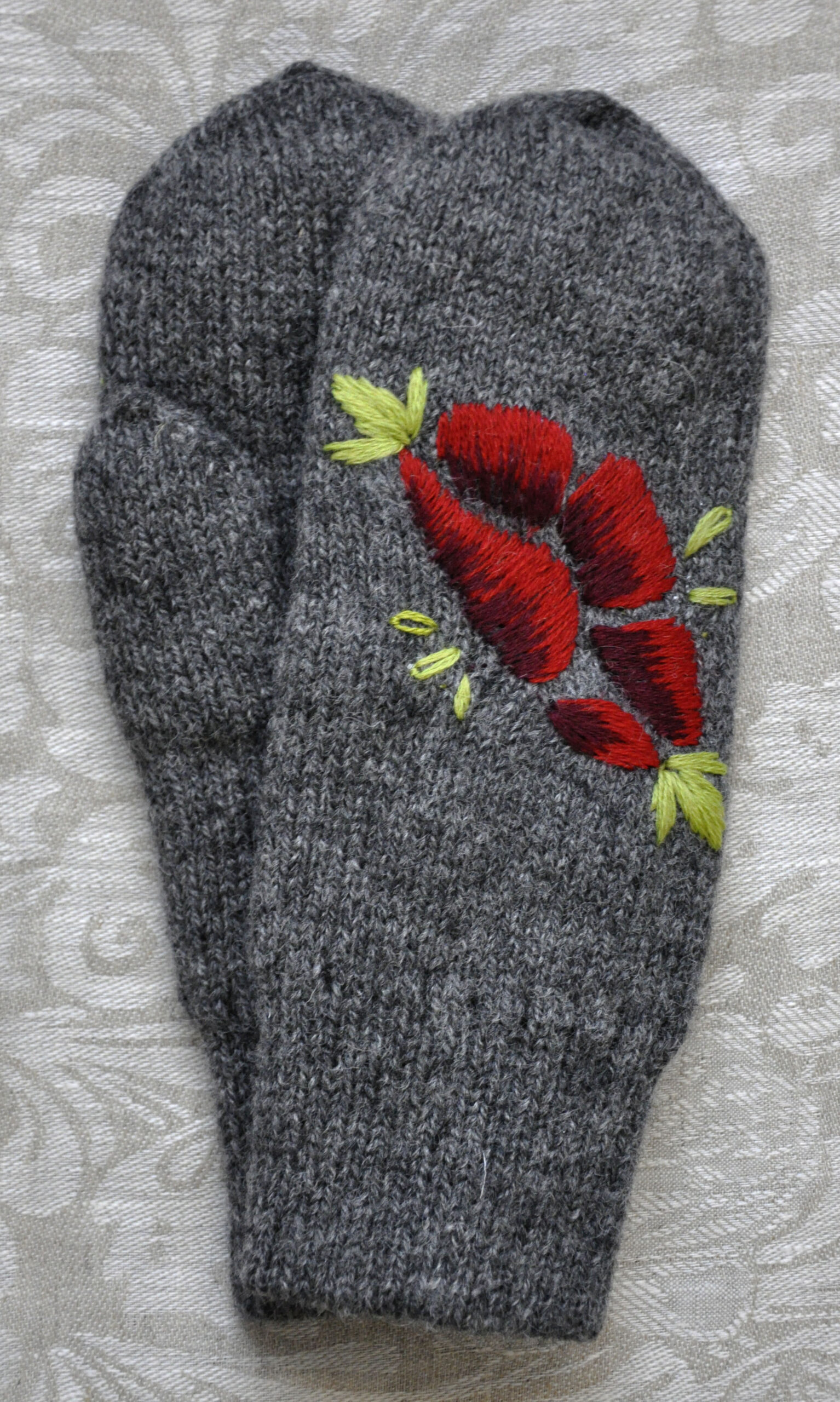 Kirjeldus: Käsikudumismasinal kootud ning käsitsi tikitud topeltlabakindad