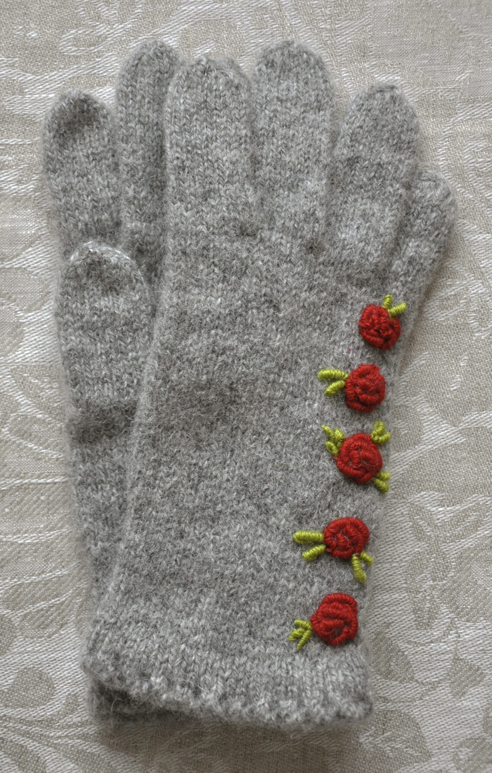 Kirjeldus: Käsikudumismasinal kootud ning käsitsi tikitud sõrmikud