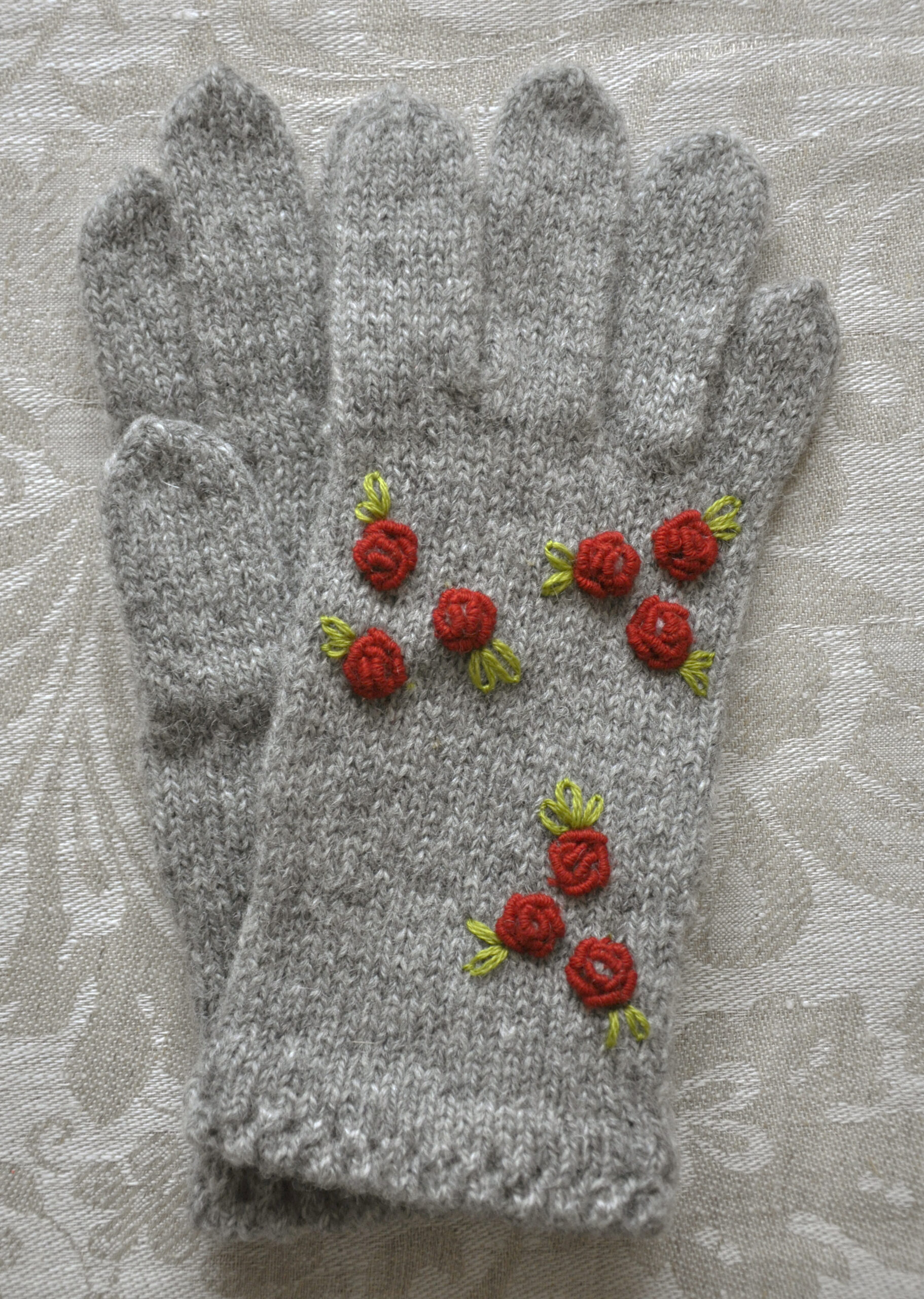Kirjeldus: Käsikudumismasinal kootud ning käsitsi tikitud sõrmikud