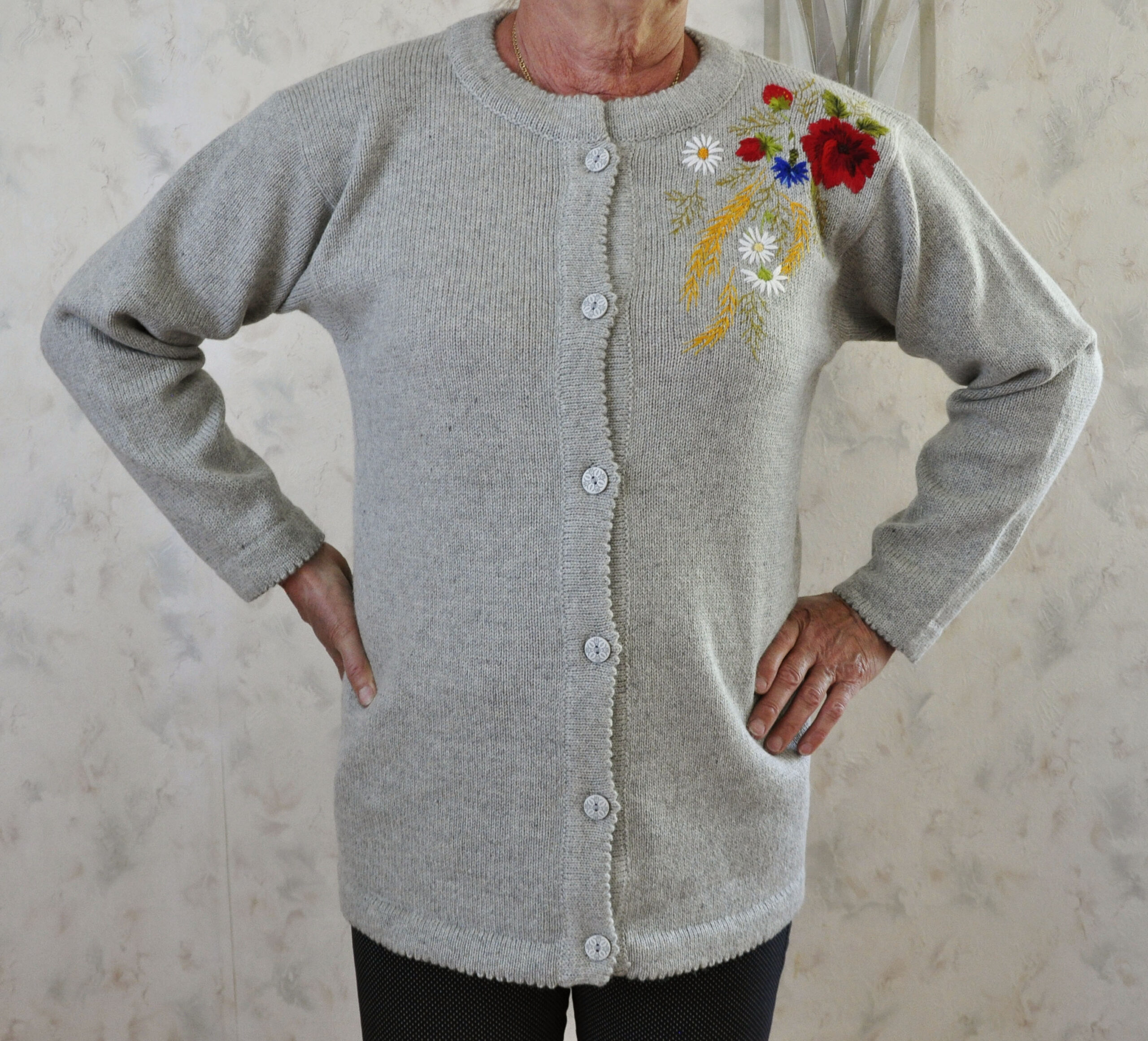 Kirjeldus: Käsikudumismasinal kootud ning käsitsi tikitud